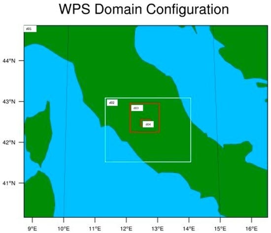 For simulations, four two-way nested domains have been defined. The number of grids of the domains (west-east/south-north) are 58 × 46, 101 × 76, 103 × 103, 100 × 70, with a land use resolution of 10 min, 2 min, 30 s, and 30 s respectively (“min” denotes arc minutes and “s” denotes arc seconds). The length (Dx and Dy in Table 1) of the coarsest domain (d01) grid is 11250 m, and the grid ratio (Parent grid ratio in Table 1) is 5 for domain 2 (d02), 3 for domain 3 (d03), and 3 for domains 4 (d04). The inner domain has been set as 100 × 70 grids, with the dimension of the grid length of about 260 m, to cover the urban area of Terni. 35 vertical eta levels are set, with a higher concentration in the first kilometers to better represent the fluxes from the surfaces. In Table 1 the inputs for WPS (The WRF Preprocessing System) are reported.