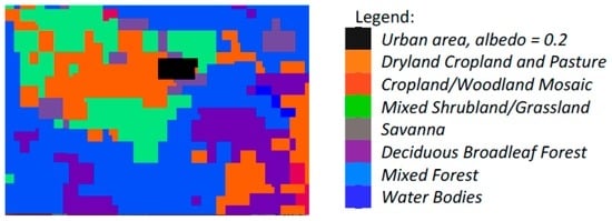 Land use for the inner domain d04. White grids are the urban grids characterized by albedo increase. Land use category data sets are matched with the USGS categories [24].