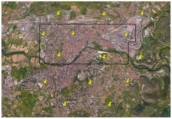 Fourteen-point grid above Terni. T1, T5, T6, T8, T9 are inside the urban area (the black line is the border of the black grids of Figure 2). T1 is in the middle of the industrial area.