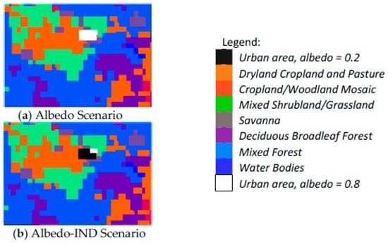 As introduced in Section 2.3, the increase of albedo in the urban and in the industrial area is simulated in the ALB Scenario and ALB-IND Scenario, respectively.