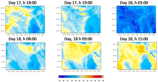 The daily trend of simulated temperatures is consistent with the trend of measured temperatures. Figure 5 provides, as an example, the trend of temperatures at weather station D from 17 July at 1 p.m. to 19 July at 11:30 p.m.