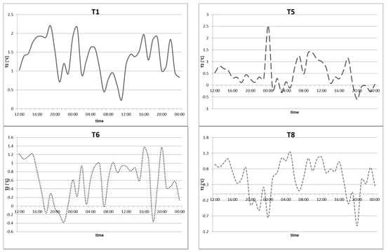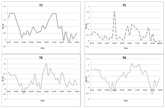 In further detail, in Figure 6 the temperatures in T5 have been compared to T12 and T10 and the temperatures in T1 to the temperatures in T3. Temperature differences between urban and rural points are positive throughout the whole day, both at night and at daytime. In particular, these values are higher at nighttime. This is because construction materials exhibit a high thermal inertia (i.e., a low response to temperature changes), and consequently, they continue releasing heat slowly after sunset and even near dawn, when most of the rural surfaces have cooled down [48].