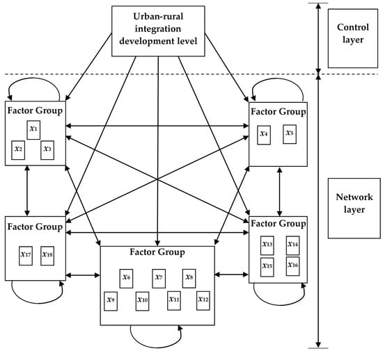 The predecessor of the Analytic Network Process (ANP) is the Analytic Hierarchy Process (AHP) proposed by Professor Thomas L. Saaty of the University of Pittsburgh. In the AHP, internal factors in the same hierarchy are relatively independent. There is no mutual influence or dependent relationship between the factors [,]. Nevertheless, various factors in urban–rural integration have a mutual impacted, making it hard to divide various factors into an internally independent, progressive, hierarchical structure. The interaction between factors mainly presents a network-like structure. The ANP exactly adapts to such a demand and is developed into a systematic decision-making method extended from the AHP. For an internally independent network structure, ANP may be more suitable.