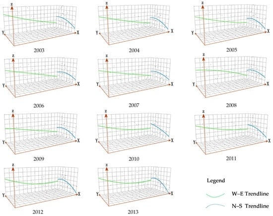 The result of spatial trends analysis indicates that the urban–rural integration development level of the Qinling-Daba Mountains shows a high–west, low–east trend in the longitude direction and a trend of high in the middle area, relatively low in the north, and lowest in the south in the latitude direction. Specifically speaking, in the longitude direction, counties in the west are higher than the counties in the middle; the east part on the whole is not as good as the western part, although the eastern section of the trend line starts to rise slightly from 2010.