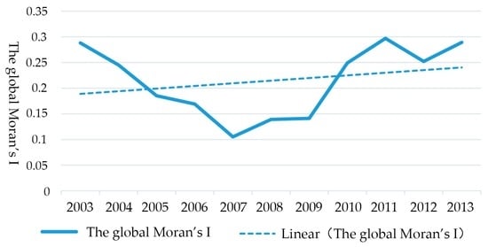 Global spatial autocorrelation analysis is used for determining spatial features of geographic phenomena in the whole study area, whether or not spatial agglomeration exists. Moran’s I index is a measurement index of global spatial autocorrelation []. The value of Moran’s I is within the scope of [−1, 1]. Moran’s I > 0 means positive spatial correlation; Moran’s I < 0 means negative spatial correlation; Moran’s I = 0 means uncorrelated.