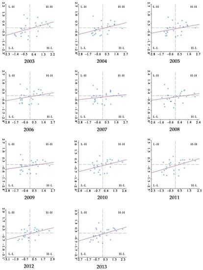 The spatial relationship between a certain territory unit and its adjacent units can be analyzed through the drawing of a Moran scatter diagram. The Moran scatter diagram for each year in the Qinling-Daba Mountains (Figure 5) indicates that the urban–rural integration development level of 25 counties in the Qinling-Daba Mountains was clustered around two terminals. The Moran scatter diagram can be divided into four quadrants, corresponding to four types of local spatial forms between the county and its neighbors. The first quadrant (H–H) shows that regional units of high observed value are enclosed by a high-value area. The third quadrant (L–L) shows that regional units of low observed value are enclosed by a low-value area. The counties in the H–H and L–L quadrants are different every year (Table 4).