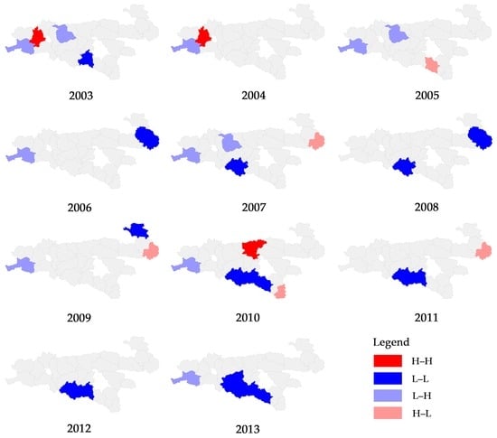 According to the changing Moran’s I values over the years (Figure 4), the urban–rural integration development level in the Qinling-Daba Mountains can be divided into two phases. The first phase is from 2003 to 2007, when the spatial clustering extent of the urban–rural integration development decreased year after year. The polarization in space decreased, and there was a similar trend for regional development. The industrial development in the Qinling-Daba Mountains established a certain baseline during the Third-line Construction period in the late 1960s and 1970s, but the industry activity has reduced gradually due to inconvenient transportation, miscommunication of information, and slow update of techniques, etc. Thus, the spatial clustering of regional urban–rural integration development reduced, and the entire region was in a low-level, balanced development state.
