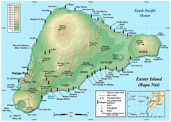 - Wikimedia Commons. File: Easter Island map-en.svg. Eric Gaba (Sting), translated by Bamse, licensed under CC BY-SA 2.5. Available online: http://creativecommons.org/licenses/by-sa/2.5 (accessed on 2 September 2016).