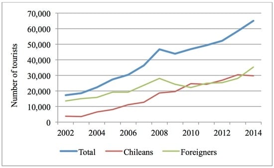 - There is no available data on the total number of visitors to the Rapa Nui National Park for the entire 2015. The only numbers available are for the months of January and February, when a total of 11,038 Chilean and foreign tourists visited the park (CONAF. Estadísticas de Visitantes años 2004–2015. CONAF, SNASPE, 2016. Available online: http://www.conaf.cl/parques-nacionales/visitanos/estadisticas-de-visitacion/ (accessed on 4 February 2016).