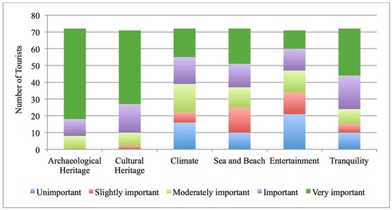 The surveys we applied to Chilean and foreign tourists in the island showed that the three most important reasons for visiting the island were the following: (a) archaeological heritage (69% among Chileans and 78% among foreigners); (b) cultural heritage (73% among Chileans and 52% among foreigners); and (c) tranquillity (65% among Chileans and 24% among foreigners) (see Figure 3).