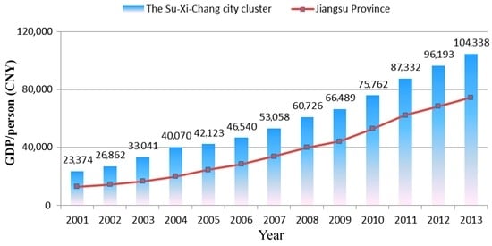 Gross domestic product (GDP) of the Su-Xi-Chang city cluster (2001 to 2013).
