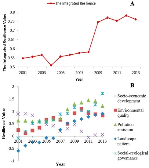 The total social-ecological resilience score of the Su-Xi-Chang city cluster generally exhibited an upward trend from 0.548 in 2001 to 0.760 in 2013, signifying a period of adaptive evolution, as illustrated in Figure 4A. A multiscale analysis of resilience is fundamental to an understanding of the dynamics and development of intertwined urban systems. In this study, the trend in integrated resilience resulted from the combined effect of all five aspects in the social-ecological system, as described in Figure 4B. From 2001 to 2013, resilience related to environmental quality, pollution emission, and landscape pattern and social-ecological governance increased by varying degrees, whereas resilience related to the social-economic development decreased. As shown in Table 2, the first principal component matrix of variables derived from the PCA presents the respective contributions of the indicators to the values of the sub-system’s resilience, using the scoring range: 0 = no impact up (down) to 1 (−1) = high impact. Specifically, the closer an indicator’s absolute value gets to 1, the greater its contribution to the values of the sub-system’s resilience. Different scores indicate the heterogeneity of the resilience in terms of various disturbances. More concretely, in response to relatively small disturbances that have relatively low scores, the social-ecosystem returns to “normal” with relative ease following the disturbances, such as discharge of solid waste, environmental violations and utmost highest/lowest temperature of the year. However, large or infrequent disturbances that have relative high scores might push the system into an undesirable state, a factor that should be given significant importance in resilience governance, such as fierce urban land expansion and a massive blue-algal bloom in Taihu Lake. Furthermore, the resilience from social-economic governance had been strengthened, but the score of employees in public administration and social organizations was as little as 0.051 in the first component of PCA. This suggests that public participation had a low effect on socio-ecological resilience governance during the period of 2001–2013, which conforms to the situation of the study area that lacked horizontal communication in the processes of decision-making, policy design, and implementation.