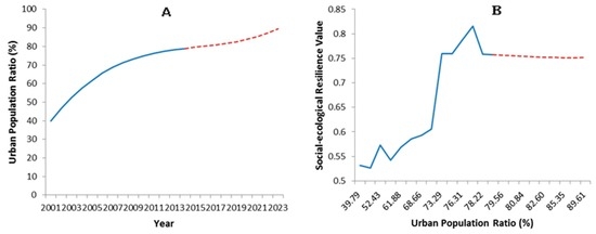Scenario analysis: (A) predicted trends in urban population ratio and (B) the resilience with increasing urban population ratio.