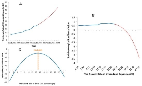 Scenario analysis: (A) predicted trends in the growth rate of urban land expansion and (B,C) the resilience with increasing urban land expansion.