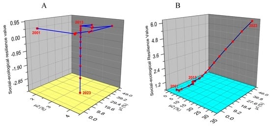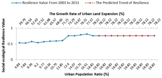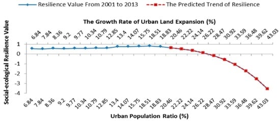 From 2001 to 2013, UPR in the study area grew from 39.79% to 78.22%, and ULG increased from 6.84% to 18.83%. The environmental changes associated with urbanization have been significant during the last century, and are expected to continue through the next several decades. Therefore, in accordance with this trend, it is predicted that UPR will experience moderate growth (Figure 6A) in the future, while ULG will increase sharply (Figure 7A). Therefore, according to the variable relationships given in Equation (10), and based on the assumption that the other indicators kept the status quo, one analysis shows that levels of resilience will be persistent (Figure 6B) if UPR continues to increase according to the trend from 2001 to 2013; however, another analysis finds that the resilience level will decline substantially (Figure 7B) if ULG increases in line with the trend of 2001 to 2013. Accordingly, continued urbanization, especially with respect to urban land expansion, can have a devastating impact on the resilience. Moreover, the study results show that social-ecological resilience in the study area will first increase in response to the disturbances caused by the processes of land urbanization and then fall off sharply. Resilience might decline if ULG increases to 16% (Figure 7C). This suggests that disturbances caused by urbanization would push the system over a particular threshold where the way it functions will change when the growth rate of urban land expansion reaches 16%.