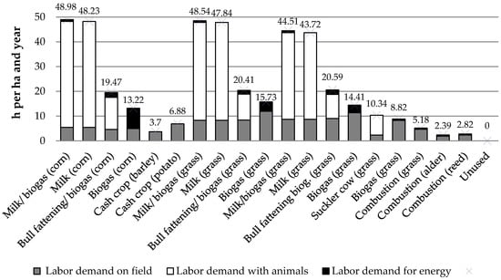 Labor demand ranged from zero h·ha−1·year−1 for unused near-natural fens to 48.93 h·ha−1·year−1 for combined milk and biogas production (Figure 2). For the same management systems in different land use systems, differences in labor demand were low. The management systems with combined milk and biogas production required the highest number of working hours per hectare and year. These systems included three major production steps: feedstuff production, animal keeping, and biogas production. Therefore, they required considerably more labor than solely crop production. Combined milk and biogas-production systems were followed by the bull fattening systems with integrated biogas production and the crop-based biogas-production systems.