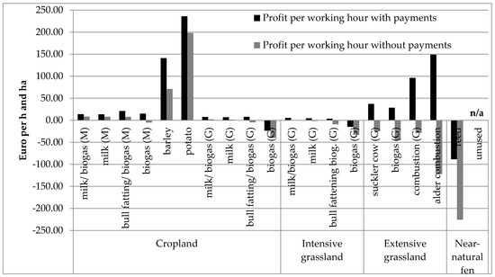 Cash crops resulted in a high profit per working hour and hectare (Figure 3). Management systems in extensive grassland reached different profitable levels per working hour and hectare, if payments for ecosystem services are included. Among others, alder production for combustion yielded the second-highest profit per working hour and hectare after potato production, if payments are considered. All other management systems indicated low profitable to unprofitable levels per working hour. Profitability per working hour depended on labor demand per activity. Management systems with a high labor-demand intensity resulted in low profit per working hour.