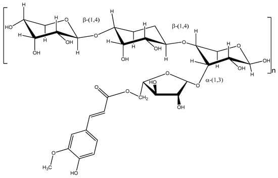Arabinoxylans (AX) are the main non-starch polysaccharides of cereal grains. AX consist of a linear chain of β-(1→4)-linked xylose units, to which α-L-arabinose substituents are attached through O-2, O-3, or both. Arabinose residues can be linked on O-5 to ferulic acid (FA) (3-methoxy-4-hydroxycinnamic acid) via esterification [5,6] (Figure 1). Several investigations have reported the positive health effects of AX due to their antioxidant and prebiotic properties as well as their immune-enhancing ability and anti-tumoral activity [7,8]. In addition, AX can form covalent gels by the oxidative coupling of FA, resulting in the formation of dimers (di-FA) and a trimer (tri-FA) as covalent cross-linking structures [9]. The stability of the AX gels to changes in temperature, pH, and ionic strength offers an advantage for the industrial applications of this polysaccharide. A previous study has demonstrated that AX gels can be used for the entrapment of probiotics [10,11]. However, that investigation used water extractable AX from wheat flour as a model molecule due the less complex structure of this polysaccharide in comparison to water un-extractable AX from cereal brans. In this regard, maize bran is a richer and cheaper source of this polysaccharide, especially when AX are recovered from by-products of the food industry, which has received increasing attention and would offer new advantages for future industrial applications of this polysaccharide. However, to our knowledge, the probiotic loading capability of gelling maize wastewater arabinoxylans (MWAX) has not been reported. The objective of the present study was to investigate the capability of MWAX to encapsulate probiotics and to investigate the rheological and microstructural characteristics of the bio-based material formed.