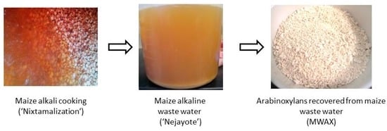 In the past, Mesoamerican Indians learned that wood ashes facilitated maize cooking, the removal of the hard outer covering, and improved the quality of the resulting material. We now know that this process also releases the bound niacin in the maize into a readily available form [1], preventing the population from suffering the ravages of pellagra. In Mexico, alkali cooking called “nixtamalization” (from the Nahuatl nixtli = ashes and tamalli = dough) is extensively used to improve maize texture and nutritional value [2]. Maize nixtamalization is important in Mexico, as half of the total volume of consumed food is maize, which provides approximately 50% of the energy intake, this proportion being even greater for lower income groups. The waste water generated from this maize processing is called “Nejayote” which is highly alkaline, with high chemical and biological oxygen demands, and is considered an environmental pollutant. A typical maize nixtamalization facility processing 50 kg of maize every day uses over 75 L of water per day and generates nearly the equivalent amount of alkaline waste water in 24 h [3]. Thus, alternatives of maize alkaline waste water utilization in Mexico are needed. During the nixtamalization process, maize bran is removed from the kernel, and some of the cell wall components such as arabinoxylans are partially solubilized in Nejayote. In fact, Nejayote has been previously reported as a source of gelling arabinoxylans [2,3,4].