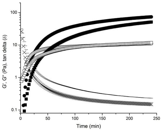Monitoring elastic modulus (G′), viscous modulus (G″), and tangent delta (tan δ, G″/G′) during rheological kinetics of 10% (w/v) MWAX solution gelation without probiotics (G′ ●, G″ ○, and tan δ x) and containing Bifidobacterium (1 × 107 CFU/mL) (G′ ■, G″ □, and tan δ -). Laccase was used as cross-linking agent. Rheological measurements at 25 °C, 0.25 Hz, and 5% strain.
