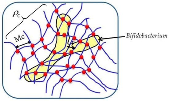 The structural parameters molecular weight between two point cross-links (Mc), cross-linking density (ρc) and average mesh size (ξ) in MWAX gels, were calculated from the swelling experiments as reported previously [9]. The equilibrium swelling of MWAX gels at 10% (w/v) was reached between 15 and 20 h presenting a swelling ratio (q, g water/g polymer) value of 49 g water/g MWAX. The swelling capacity of a gel is directly related to the chemical structure and conformation of the polymer as well as the degree of cross-linking of the polymer network [22,23]. In addition, the q value is a measurement inversely proportional to the strength of the polymer gel, where higher q values represent a weak polymeric gel structure with high water absorption. The Mc, ρc, and ξ value of the MWAX gel found in the present study are reported in Table 2. The q, Mc, ρc, and ξ values found were similar to those reported for other maize AX gels using peroxidase/H2O2 or laccase as cross-linking agent [24]. It has been reported that the characteristic rod or clubbed shape of Bifidobacterium varies from 0.5–1.3 μm × 1.5–8 μm [26], which is around 11 times higher than the ξ value (413 nm) found for MWAX gels in the present study (Figure 5). This mesh size/bacteria dimensions ratio could explain the MWAX capability to encapsulate Bifidobacterium and may protect the contained cell during food processing or gastric conditions. In Figure 6 a section of the MWAX polymer network containing Bifidobacterium is shown.