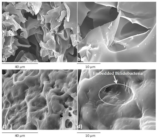 Scanning electron microscopy of lyophilized MWAX gels (a,b) and MWAX gels containing Bifidobacteria (c,d). Images (a) and (c) at 1500×; (b) and (d) at 3500×.