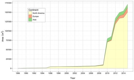 Figure 3 shows the cumulative area over time of established URFs by continent. The graphic illustrates that North America does not only have the highest number of URFs, but also the largest installed area. However, Europe and Asia have also been installing new farms in the past years. URFs seem to be turning into a global trend.
