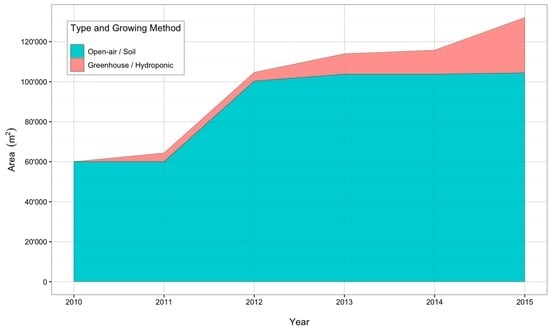 Figure 4 shows the development of the cumulative area of URFs since 2010 when the first commercial farm (Brooklyn Grange [25]) started operations. Despite the fact that the graphic seems to suggest that there are more open-air farms than greenhouses, it is in fact just the opposite: there were only six open-air farms and nine greenhouse farms. Two very large open-air farms (Brooklyn Grange [25]), made up 96% of the open-air farm area that existed in 2015. The actual trend is moving towards greenhouses with hydroponic systems, with nine farms in operation in 2015. This is the type of farm that has grown the fastest since 2012. All commercial greenhouses are run using hydroponics, while all open-air farms are soil-based.