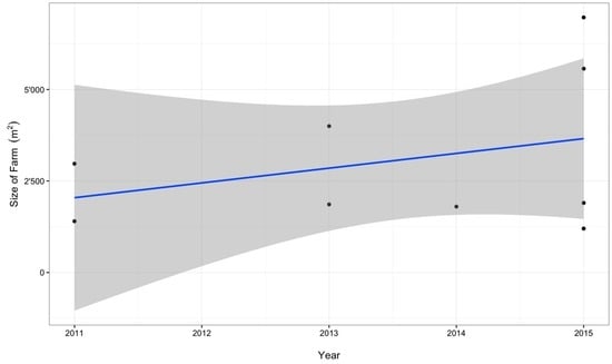 Figure 5. Sizes of new commercial hydroponic greenhouse farms over time, with regression line (blue) and confidence region (grey).