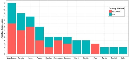 Figure 6. Most commonly produced products in commercial urban rooftop farms by growing method (hydroponic/soil).