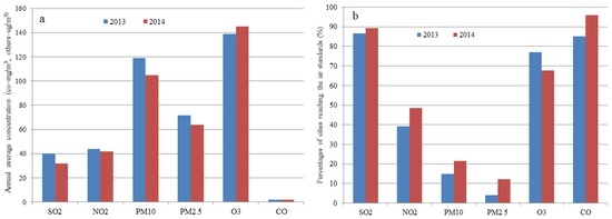 Annual average concentrations of pollutants (a) and the percentages of cities that achieved the set air standards (b). Data provided by the Ministry of Environmental Protection of China.