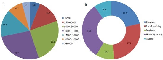 According to statistics, 26.7% and 25.3% of the respondents received an annual family income ranging from 10,000–15,000 and 5000–10,000 Chinese Yuan, respectively, contributing to the highest percentages of annual family incomes (Figure 2). A limited number of local residents had an annual family income of more than 20,000 Chinese Yuan. Overall, rural residents’ incomes have increased due to the Chinese policy of abolishing rural taxation via rural taxation reform [14]. The primary income for the majority of respondents was from working in the city, accounting for 31.6% of the total incomes. Local employment (27.1%) and farming (21.3%) represented the second and third places for residents’ income sources, respectively. With the development of urbanization, industrialization and modernization, more laborers are needed in cities, e.g., in the construction and service sectors [15]. Therefore, it is not surprising that the incomes of most families came from working in cities. There was a significant difference (p < 0.05) between family incomes and education levels among all of the respondents.