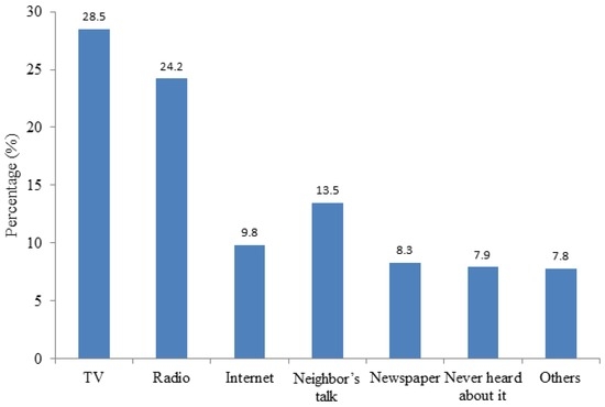 A substantial proportion of residents (8%) from the Xinjie rural areas had never heard of smog (Figure 3); most of them were older than 55 years and had a low education level. This is in line with research carried out by Dijkstra and Goedhart [16], who suggested that education level correlated with people’s knowledge about certain topics. Most of the respondents accessed smog information from different channels. A majority of the respondents (28.5%) accessed smog information from TV, followed by the radio (24.2%) and neighbors (13.5%). The percentages for TV and radio as smog information access channels were significantly (p < 0.05) higher than for other channels. In rural areas, almost every family has a TV and/or radio; it is therefore convenient for them gain smog information this way, for example from weather forecasts or news programs. A small proportion of the respondents (9.8%) could access the Internet using a computer or smart phone, where they were able to read news or reports online. It is not surprising to see that 90% of respondents from this proportion are aged less than 45. The findings also show that 8.3% and 7.8% of local people suggested that smog information was available to them via newspapers or other channels, respectively.