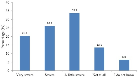 Most of the respondents thought that smog pollution in villages was somewhat severe, accounting for 33.7% of the total respondents (Figure 4). In contrast, 26.1% and 20.4% of residents agreed that smog pollution in villages was severe and very severe, respectively. The findings in this study contrasted those achieved by Wang et al. [18], who carried out a survey in Zibo City and suggested a majority of respondents (60.2%) recognized that smog pollution was very serious. Compared to city residents, who constantly receive information or alerts about severe air pollution via the media, rural residents were much less aware of smog pollution. For example, 13.5% of respondents denied any smog pollution and 6.3% did not know whether smog pollution was severe or not. This may have been because they had little knowledge about smog; additionally, it is also easy for them to mistake smog for natural fog. In addition, in Chinese rural areas, farmers care more about factors such as income and food and show less concern for the environment. Research by Lawson et al. [19] suggests that the economic level in a region correlates with the environmental awareness and concerns of the local people. However, with the development of rural areas, environmental issues will inevitably receive growing attention.
