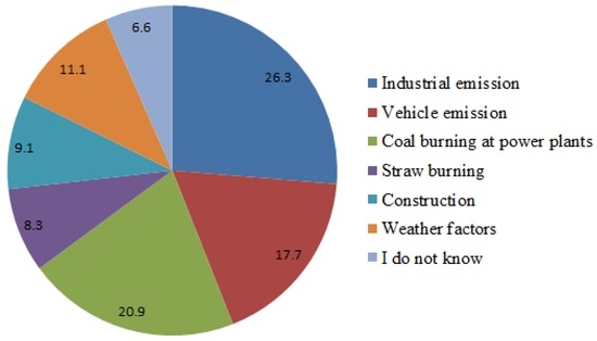 The survey results showed that most of the respondents realized that anthropogenic activities are to be blamed for smog pollution (Figure 5); 26.3% of residents thought the main contributor to smog pollution lay in industrial emissions, followed by coal burning at power plants (20.9%) and vehicle emissions (17.7%). This is partially in accordance with results achieved by Wang et al. [18], who conducted a similar survey within a city and found three major recognized causes, in the following order: industrial emissions, vehicle emissions and coal burning at power plants. Straw burning in the field was believed to be the main cause of smog pollution by 8.3% of respondents. In China, it is very common for farmers to burn straw in fields or on-site, since they view burning as the easiest way to dispose of agricultural waste. However, during our survey we discovered that most farmers, especially those with lower education levels, did not recognize that straw burning can contribute to environmental pollution. Straw burning can generate a range of air contaminants such as particulate matter, organic carbon, elemental carbon and 32 polycyclic aromatic hydrocarbons [20]. Most of the individuals surveyed in this case study complained that leaving straw on farmland would affect the growth of the next season’s crops. Thus, air pollution control from straw burning in China calls for efficient recycling, i.e., its return into soil as fertilizer or application in biogas production via anaerobic digestion [21].