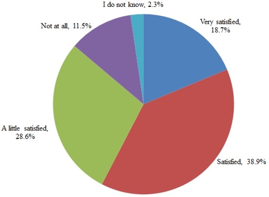 It appears that most of the respondents were satisfied with the government’s performance related to smog control: 18.7% were “very satisfied”, 38.9% were “satisfied” and 28.6% were “somewhat satisfied” (Figure 6). In contrast, only 11.5% of those surveyed chose the “not at all” satisfied option (88.5% of the respondents from this proportion had higher education levels, e.g., vocational school and college), indicating that they were unhappy with the government’s response on this issue.
