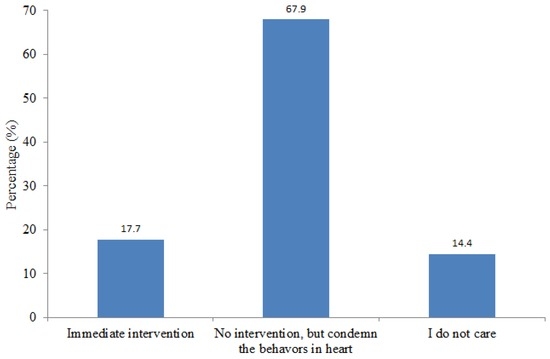 In terms of respondents’ potential action for intervening in an activity that causes smog pollution, different opinions were measured among the respondents. A predominant percentage of respondents (67.9%) chose to remain silent without any intervention, despite not liking behaviors that led to smog pollution (Figure 7). These respondents may instead passively wait for environmentally conscious individuals to act on their behalf [24]. Only 17.7% of the surveyed people wanted to be involved in interventions. A limited number of respondents (14.4%) did not care about smog-causing activities. This may have been because they were unaware of the relevant harmfulness of smog pollution, or because they thought intervention was not their business, which is a common psychological phenomenon [18]. There was a significant (p < 0.05) positive relationship between respondents’ intervention choices and their education levels. People with slightly higher education levels (e.g., high school, vocational school and college) were more prone to protecting the environment and becoming involved in fighting smog pollution. In addition, more male respondents chose to be involved in interventions, accounting for 68.1%. Thus, public education targeting rural residents with lower education levels should be improved.