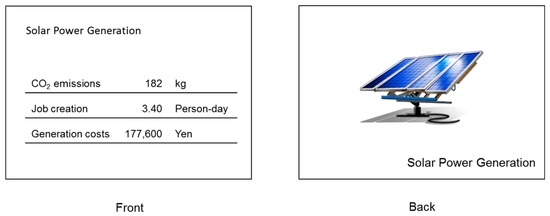 - Participants rank-ordered the cards with sustainability information (attribute value for each criterion), after attending a lecture on renewable energy technologies. An example of a card with sustainability information is shown in Figure 2. In the lecture, after showing an outline of energy consumption and characteristics of renewable energy technologies, the meanings of life cycle CO2 emissions, life cycle job creation, and life cycle electricity generation costs were explained. At the same time, cards with sustainability information were shown on the screen in the lecture room.