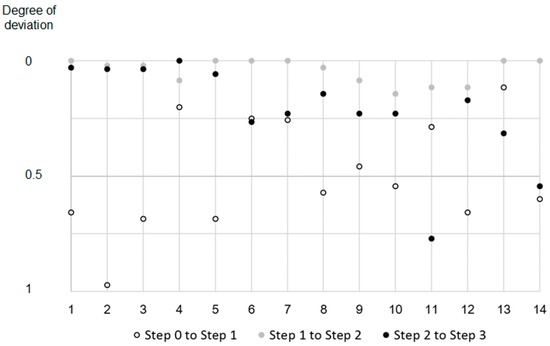 Participants’ preferences between the steps. The degree of deviation between two adjacent steps is shown in the vertical axis. The numbers in the horizontal axis signify each of the 14 respondents.