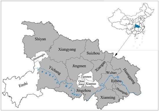 We used balanced panel data during 2003–2013 of 12 pilot cities in Hubei Province (Figure 1) and the other 262 cities in China. The city data come from the CHINA CITY STATISTICAL YEARBOOK [37] and the official websites of these cities’ Statistics Bureaus, while national and provincial data come from the CHINA ENVIRONMENT YEARBOOK [38].