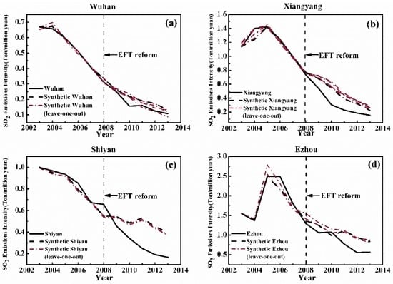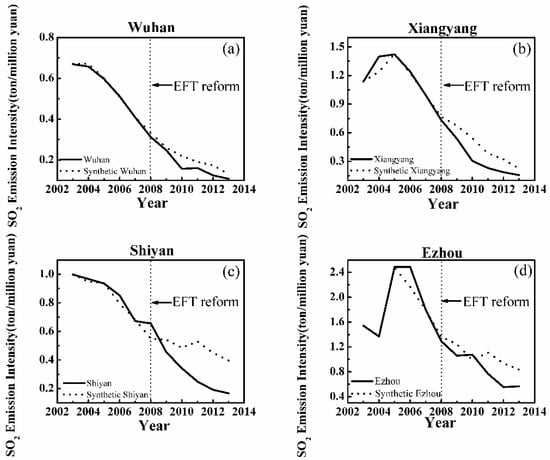 Trends in SO2 Emissions Intensity: Target Cities versus Synthetic Cities (Wuhan, Xiangyang, Shiyan and Ezhou). Notes: Solid lines represent the target cities. Dash lines correspond to the synthetic cities. Vertical dash lines delineate time of reform. (a–d) Wuhan, Xiangyang, Shiyan and Ezhou, respectively, all of which have good fitting and obvious emission intensity reduction effects. Source: authors’ computation by synthetic control program in STATA 12.
