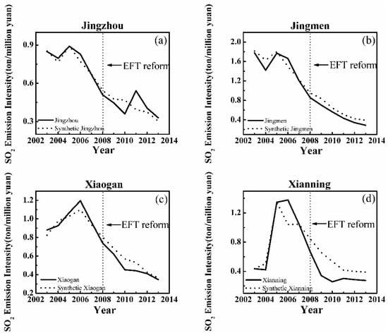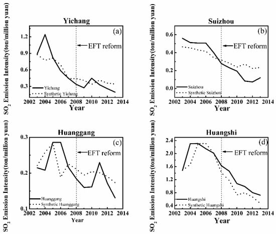 Figure 2, Figure 3 and Figure 4 show the SO2 emission intensity of each treated city and the corresponding synthetic city, in which the vertical dashed line represents the beginning year of the EFT reform. The SO2 emission intensity in most of the pilot cities and their synthetic control cities are very close on the left side of the line, while they gradually deviate on the right side. For example, the results of SO2 emission intensity in Wuhan and synthetic Wuhan are very close to each other between 2003 and 2007, but from 2008 onwards, the latter is higher, with the gap between them representing the effect of the EFT reform. Depending on the reform’s impact on SO2 emission intensity, the results of the 12 pilot cities are divided into three groups. The first group includes cities that are sensitive to the reform with a significant reduction of SO2 emission. These cities are Wuhan, Shiyan, Xiangyang and Ezhou (Figure 2). The second group includes Xiaogan, Jingmen, Xianning, and Jingzhou (Figure 3), which have obtained good synthetic objects before the reform but show relatively weak effects after that. The third group includes Yichang, Huangshi, Huanggang and Suizhou (Figure 4) with poor fitting results before the reform.