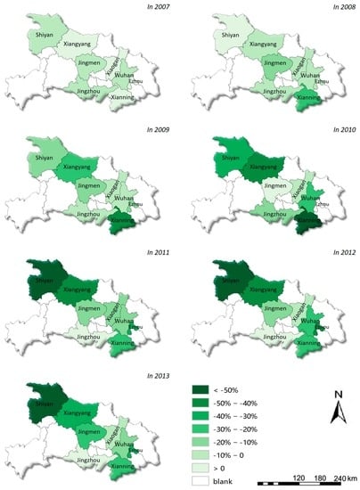 We notice that EFT has a different effect in the different space and time. We use decline rate to estimate the effect of EFT on emission intensity reduction by which the “extra” contribution of EFT policy to the environmental improvements of the target city is measured. The effect of EFT policy is divided into eight grades, less than −50%, −50%–−40%, −40%–−30%, −30%–−20%, −20%–−10%, −10%–0, and more than 0. Accordingly, the spatial variation of emission intensity reduction effect in Hubei Province from 2007 to 2013 is presented (see Figure 7). From the spatial transfer path of emission intensity reduction effect, it can be seen that the emission intensity reduction ability is embodied as following spatial differentiation and evolution characteristics of three stages.