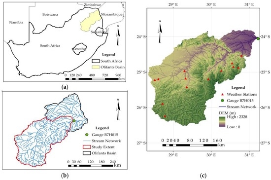 Study location within the context of South Africa (a), study extent (b) and weather stations (c).