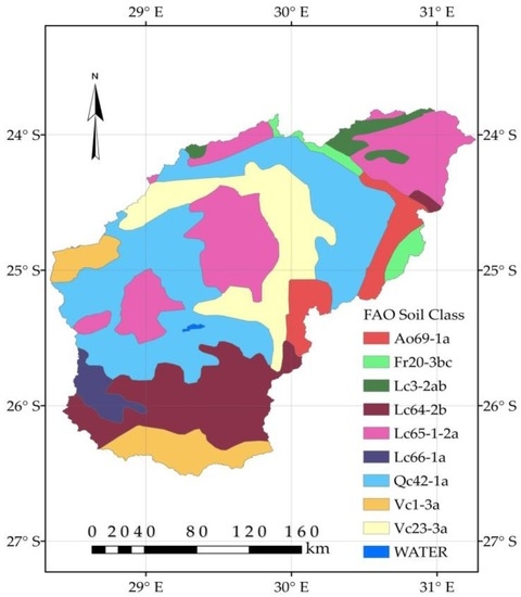 - Land Type Survey Staff. Land Types of South Africa: Digital Map (1:250 000 Scale) and Soil Inventory Datasets (1972–2006); ARC-Institute for Soil, Climate and Water: Pretoria, South Africa, 1972–2006. [Google Scholar]