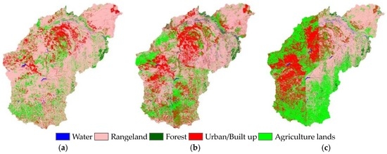 The spatial land use/cover dataset (Figure 3) used was obtained through a supervised classification of Landsat 7 ETM/ETM+ level 1 terrain-corrected satellite images. The images of spatial resolution 30 m were obtained from the Global Visualization Viewer (GLOVIS) for Path/Row; 168/077, 169/077, 169/078, 170/077 and 170/078 for three epochs of 2000, 2007 and 2013. The images were classified into five-level 1 classes (Table 2) based on the land cover and land use classification system developed by Anderson et al. [53] for the interpretation of remote sensor data at various scales and resolutions.