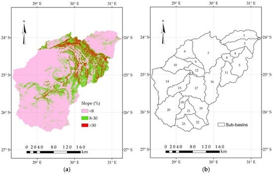 A three-arc second (90 m × 90 m) pixel resolution SRTM DEM (Figure 1c) obtained from the Consortium for Spatial Information of the Consultative Group of International Agricultural Research (CGIAR-CSI) formed the basis for the watershed delineation of the study area and further estimation of geomorphologic characteristics. Three slope classes (Figure 4a)—level to gently undulating (<8%), rolling to hilly (8%−30%) and steeply dissected to mountainous (>30%)—were extracted based on FAO classification [54]. The multiple slope classes approach catered to the different slopes that exist within the area unlike using a single slope approach. The area proportion in terms of the classified slopes were 76.57% for level to gently undulating terrain (<8%); 18.26% for rolling to hilly terrain (slope class 8%−30%) and 5.17% being steeply dissected to mountainous (slope class > 30%). Inference from the classified slopes generally portrays that the Olifants watershed has varying terrain with approximately 24% of the area having slopes greater than 8%. The steep slopes (>30%) were mainly located in the region of the escarpment. Subsequently, the basin was discretized into 23 sub-basins (Figure 4b) with hydrologic response thresholds (HRTs) of 10%, 10% and 10% for land use, soils and slopes, respectively. The defined thresholds ensure a unique combination of land use, soils and slopes in the eventual determination of hydrologic response units (HRUs) by simplifying catchment processes.