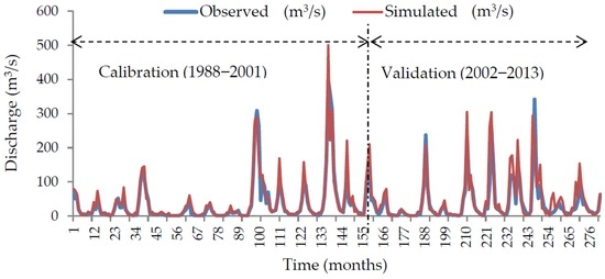 Sediment fluxes are influenced by a large number of parameters; hence, sensitivity analysis to identify the most crucial parameters became essential. The global sensitivity analysis employing SUFI-2 algorithm in SWAT-CUP 2012 version 5.1.6 (Eawag: Swiss Federal Institute of Aquatic Science and Technology, Dübendorf, Switzerland) environment was used [55] in selecting the most sensitive parameters to sediment fluxes. The global sensitivity analysis considers the sensitivity of one parameter in relation to other parameters subjected to the sensitivity analysis. A total of fourteen parameters gathered from the literature to influence sediment fluxes were subjected to the sensitivity analysis. The sensitivity of a parameter was measured by t-stat and its significance by the p-value. The higher the absolute value of t-stat for a parameter, the more significant that parameter in the sediment generation and transport process. Following sensitivity analysis, the model was initially calibrated (1988–2001) and validated (2002–2013) for streamflow [5,56]. After a successful calibration of streamflow, the model was subsequently calibrated (1994−1995) and validated (1996–1997) for sediment. Calibration and validation of streamflow and sediment were done through an auto-calibration process in SWAT-CUP 2012.
