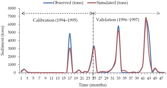 The performance of the model in simulating sediment yield was evaluated using both statistical and graphical means. The model was evaluated against four objective functions commonly used in the assessment of model performance [29,56,57].