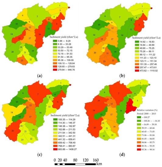 Spatial distribution of sediment yield for 2000 (a); 2007(b); 2013 (c); and sediment deviations for 2000−2013 (d).
